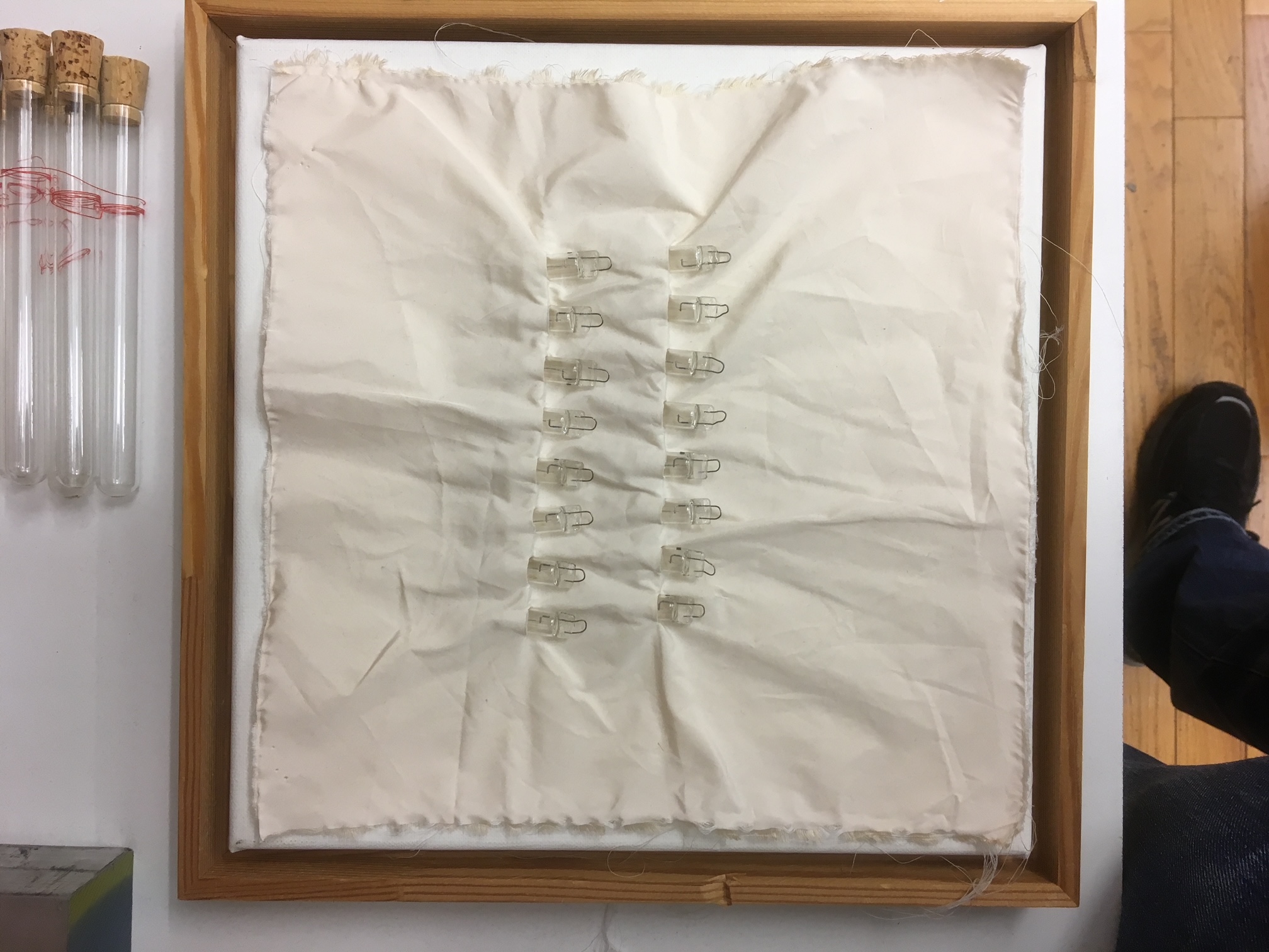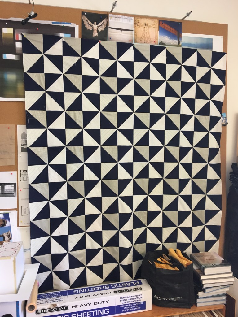 Billy has already gone through many phases in his quilting. He spoke of treating solids like a box of crayons. He went through a period where he was mildly obsessed with combining fabrics of different textures —- silk, canvas, etc. A big inspiration for Billy was the artist, Agnes Martin. He says, “her work is my North Star.” He even started experimenting with ways to weave glass with fabric using tiny light bulbs, test tubes, etc!
