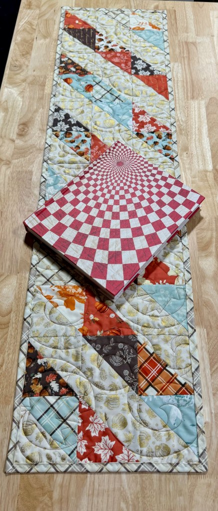 Next she created a 9 square long by 3 square high layout, aligning the corner fabric into strips. Other than backing and binding, this table topper was completely made with scraps from her throw quilt!