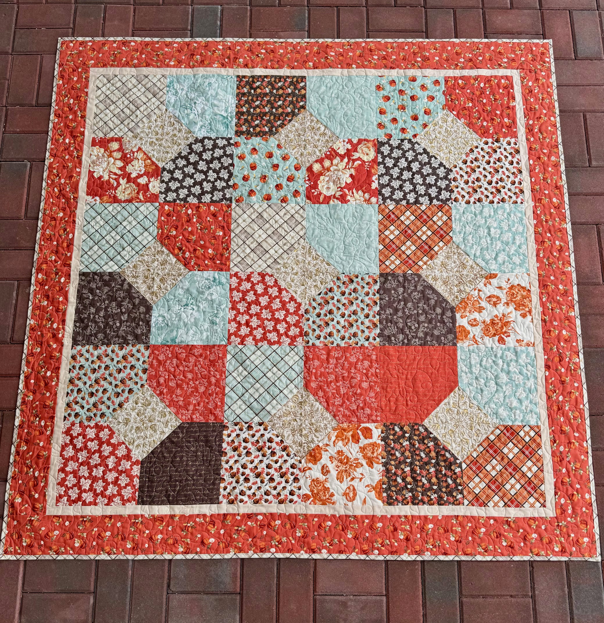 Next, quilt and bind your quilt as desired. For ours, we did an autumnal edge to edge design, but cropped our center squares and then quilted them with either a pumpkin or leaf design. It was fast, easy and super cute.