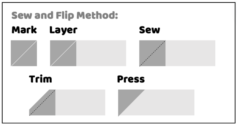 Use the Sew and Flip Method to mark a line diagonally across your 5″ squares. Then, layer a 5″ square with the right sides together on top of a 10″ square on one corner. Then, sew along the marked lin. Trim 1/4″ away from your sewn line. Iron your corner back. See the image above.