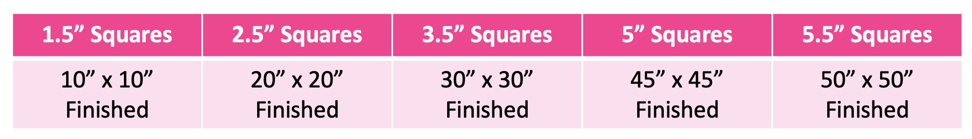 Our quilt finished to 20″ x 20″. You can make your quilt smaller or larger by adjusting the size you cut your squares at the beginning as shown below. Obviously, the larger you make you squares, the more fabric you will need.