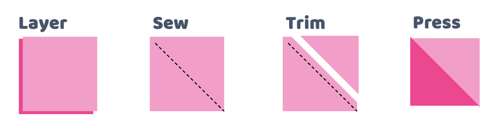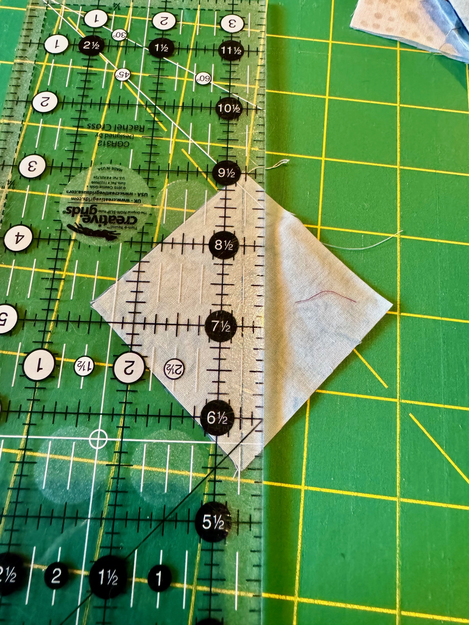 Trim 1/4″ from your seam and discard the scraps. (Or, pull a Katy and sew them together to make something else!) Press your HST, pressing the seam open.