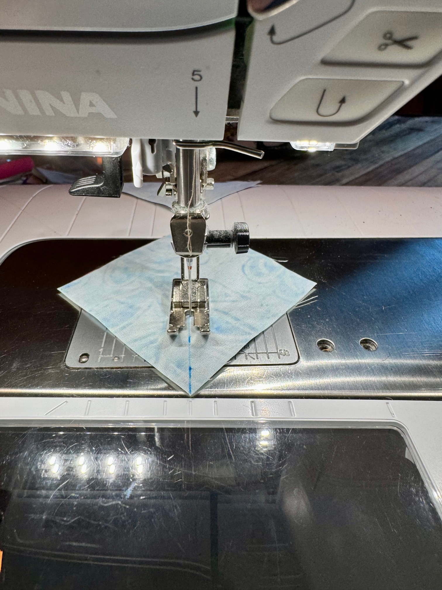 Layer a light blue square on top of the appropriate colored square, right sides together, and sew on the drawn line.