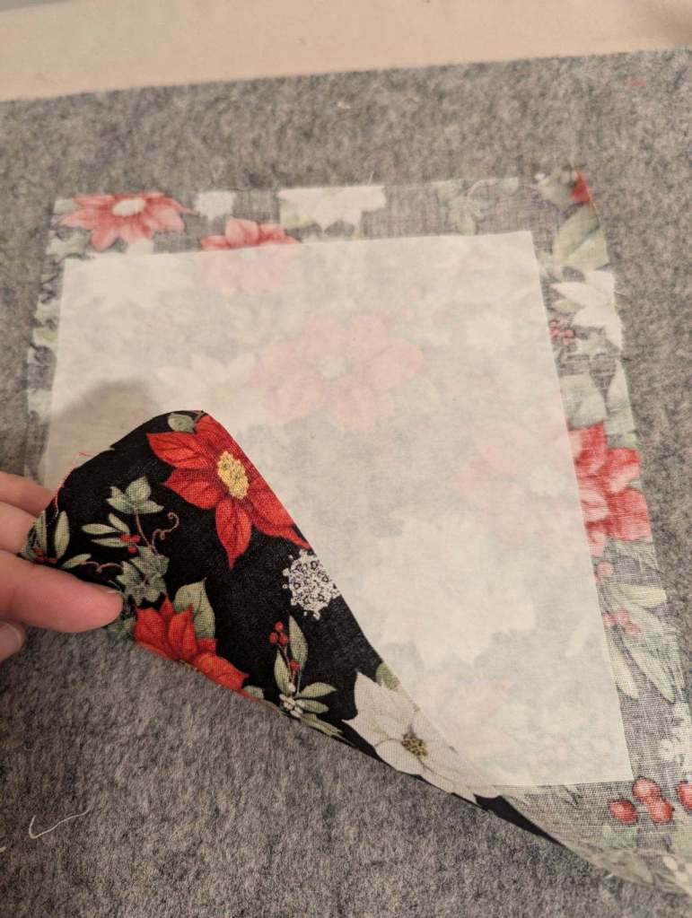 Put the exposed glue side of your tag on the wrong side of your second fabric square. Using a hot iron, fuse the tag to the second piece of fabric.