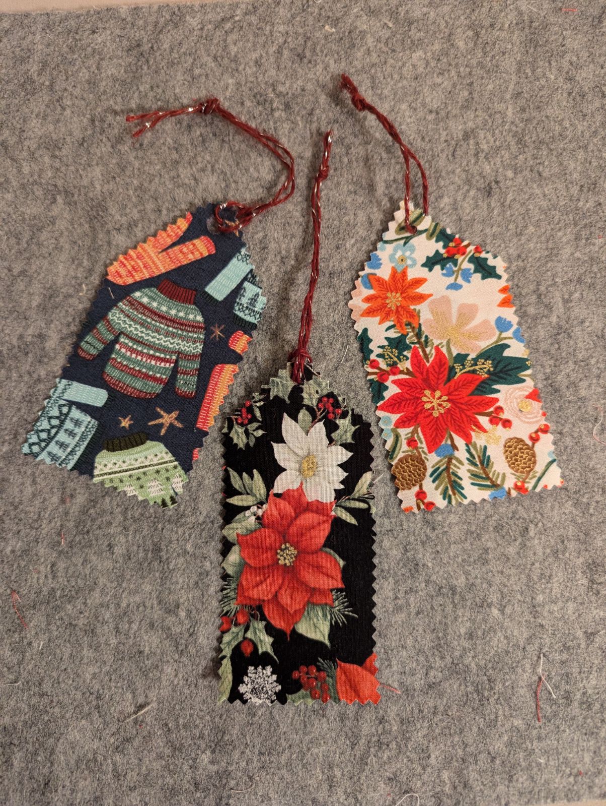 Katy helped customers make gift tags as a fun make-and-take project at our Christmas in July celebration in the store. Several people asked for instructions so we are sharing them here. Katy’s samples show holiday fabrics but you can make them with any theme to further personalize them for the person whose gift they will be adorning.