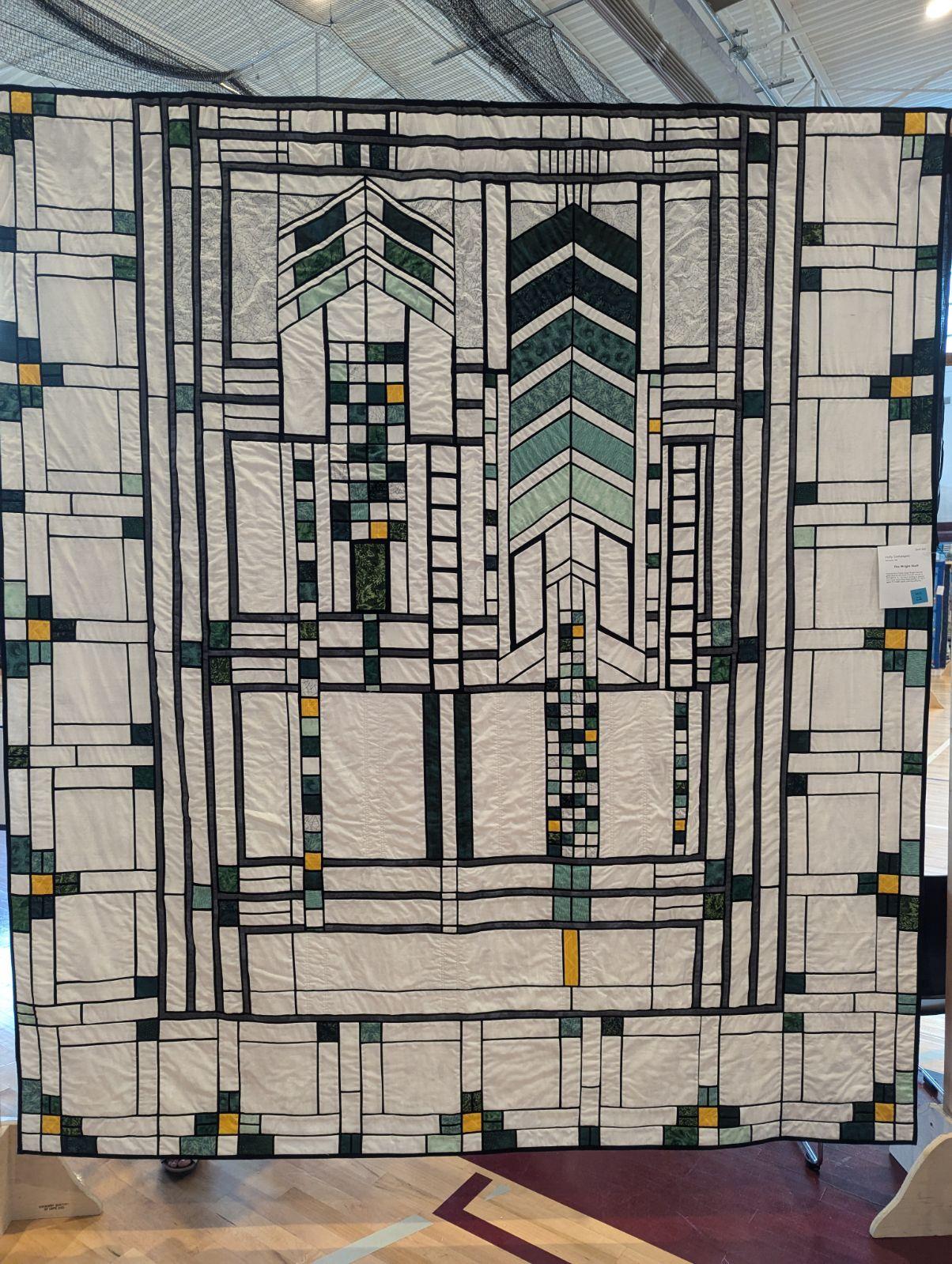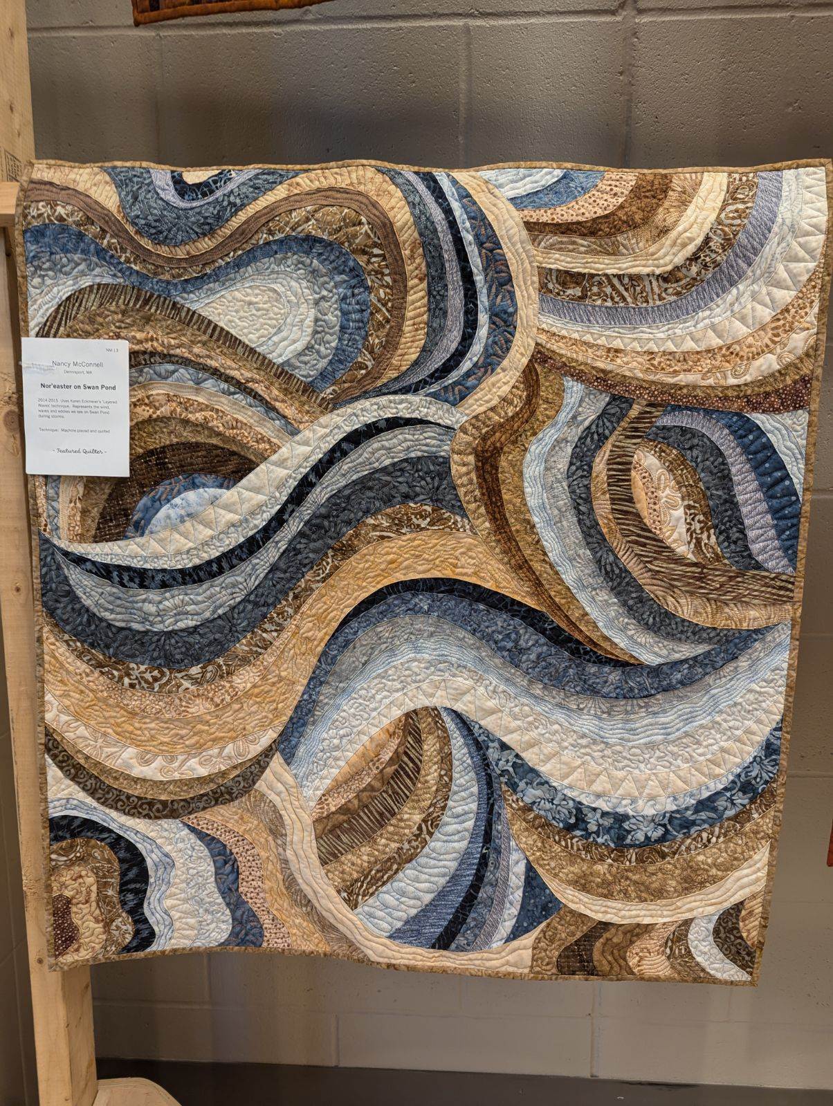 These two quilts are pretty cool. I see them as being similar in their non-traditional design and neutral color palette, yet so different in the first being very structured and the second offering so much movement. Both are spectacular. Holly Santangelo made the first, The Wright Stuff and noted that the quilt was, “Inspired by a Frank Lloyd Wright stained glass door at the Dana Thomas House in Springfield, IL.” This is proof that quilting inspiration is truly all around us. The second, Nor’easter on Swan Pond, was made by Nancy McConnell. She used Karen Eckmeier’s (a local friend!) Layered Waves Technique and says it, “represents the wind, waves and eddies we see on Swan Pond during storms.” Wow.