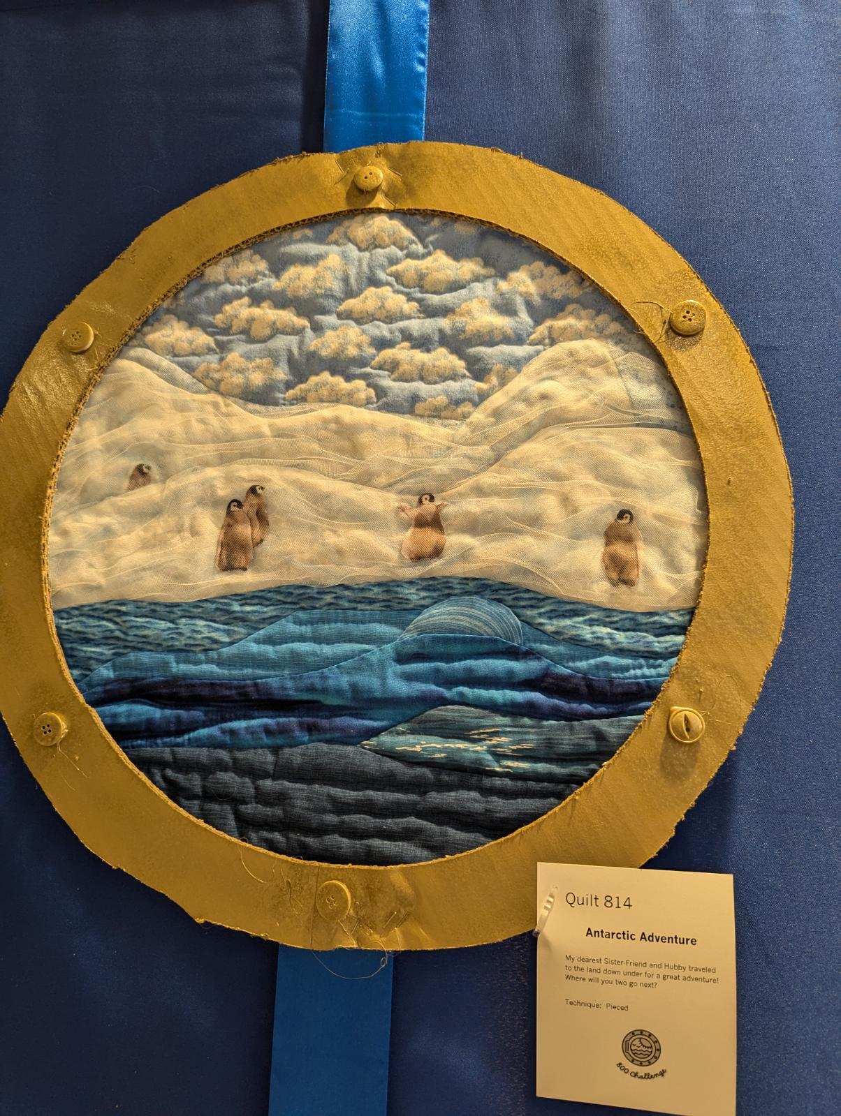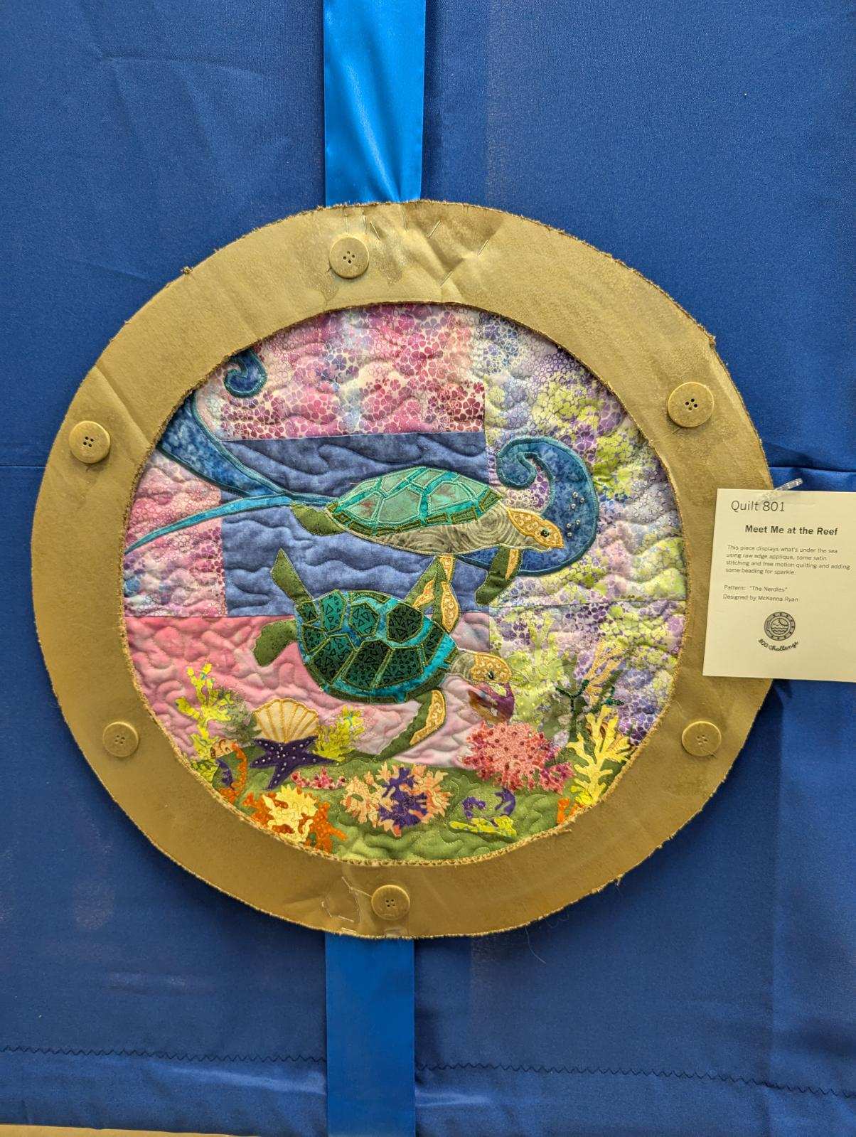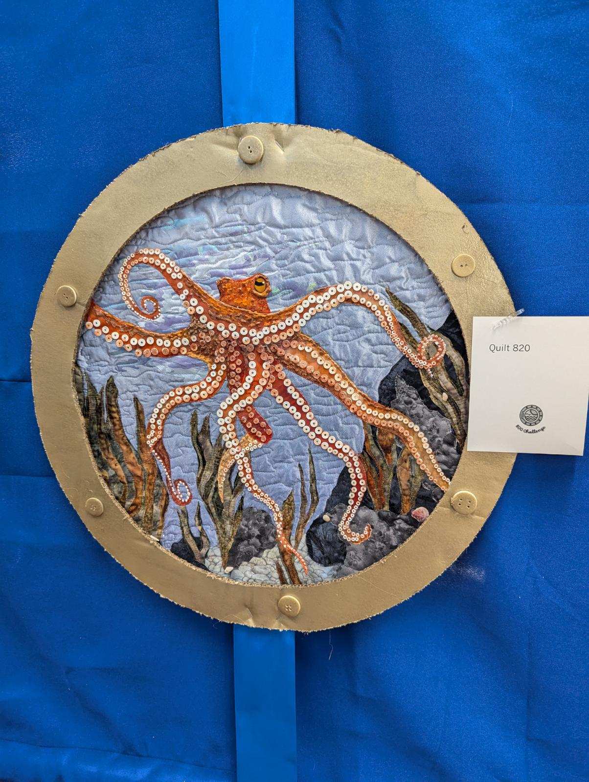 The guild challenge was to create a quilt representing the view that you might see from a boat or other vessel. It is a clever challenge and produced super interesting work. I’d be happy to look out the window of a boat and see these gorgeous creatures. It was interesting that when the challenge said, “vessel of any kind” everyone went to water – makes sense on Cape Cod. This same challenge would be interesting looking out the window of a plane. I loved the idea and the makers’ creativity.