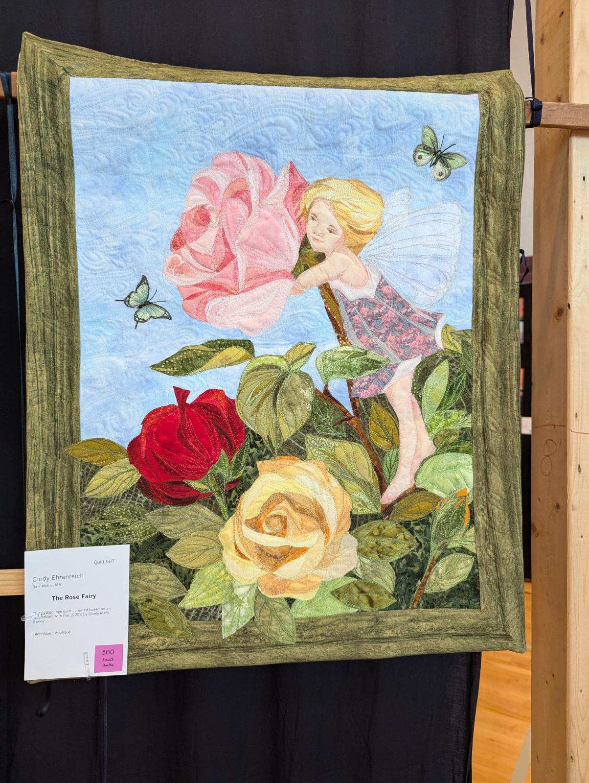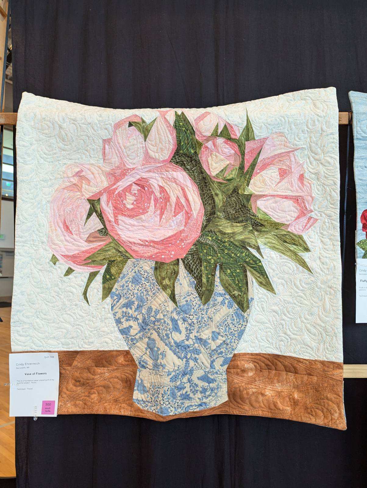 These three quilts were very summery in all their floral glory. From L-R: The Rose Fairy, Vase of Flowers, and Fluffy in the Rose Garden – all by Cindy Ehrenreich. All three of these collage quilts featured applique and captured amazing realism with the flowers.