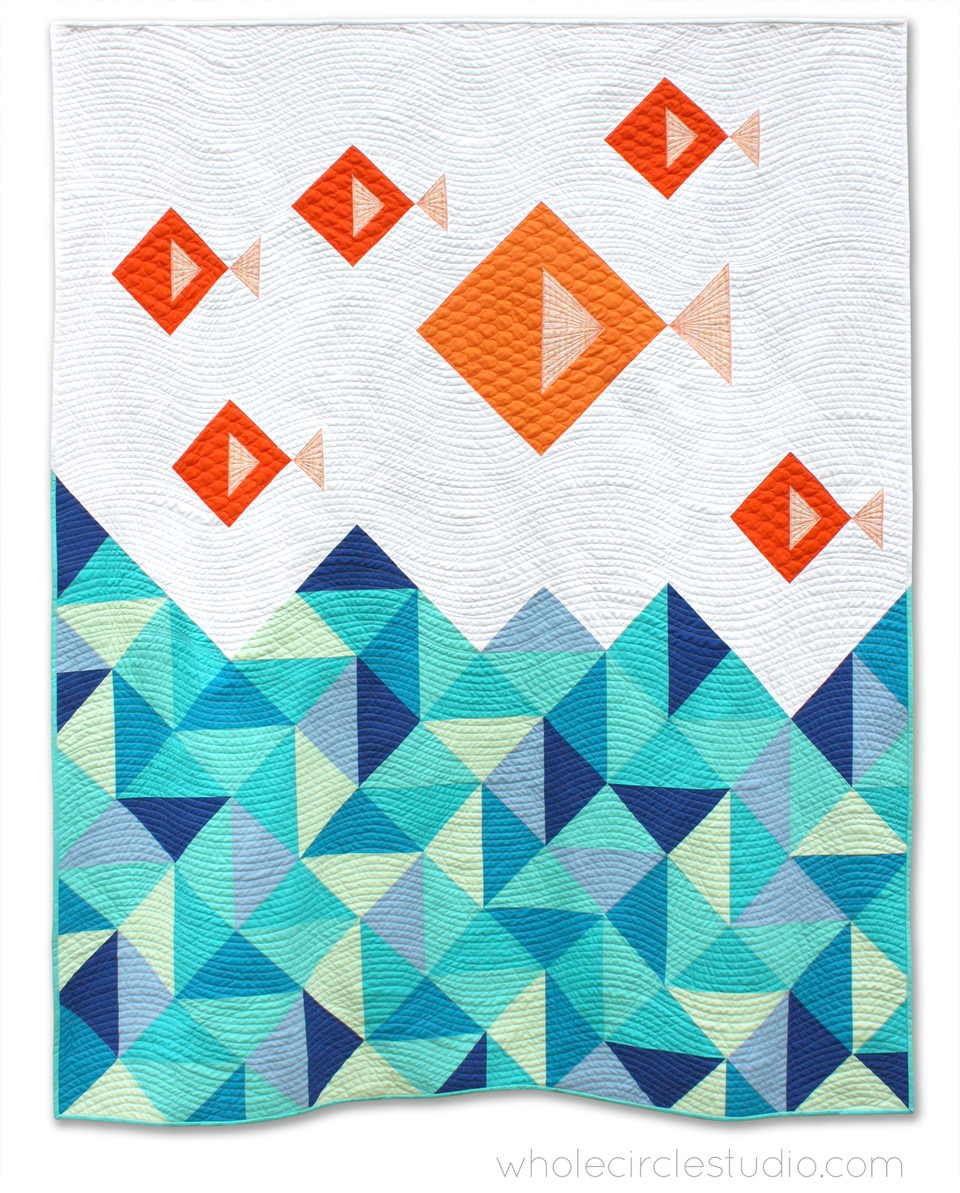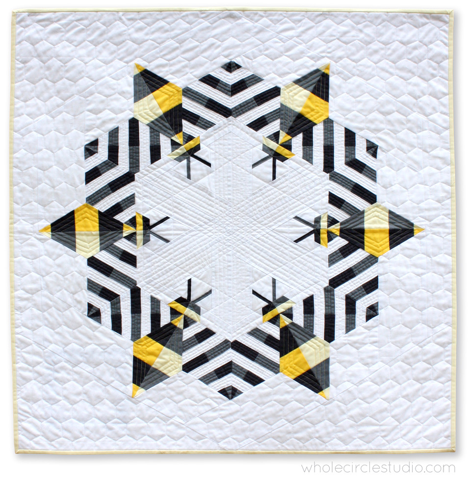 Sheri made her famous Bzzzzzz Mini Quilt and Wall Hanging in 2014. She made the quilt as part of a fundraiser and competition for the Quilt Alliance. I remember seeing the quilt way back then and loving it. It definitely changed my perspective – something as basic as a bee being presented in such a graphic way was really interesting to me. And I wasn’t alone – Bzzzzzz generated a lot of online buzz (pun intended) and people started asking for the pattern. Around the same time Sheri designed a Row by Row block for another store, which was a version of the pattern that became her first commercial pattern, Little Fishies.
