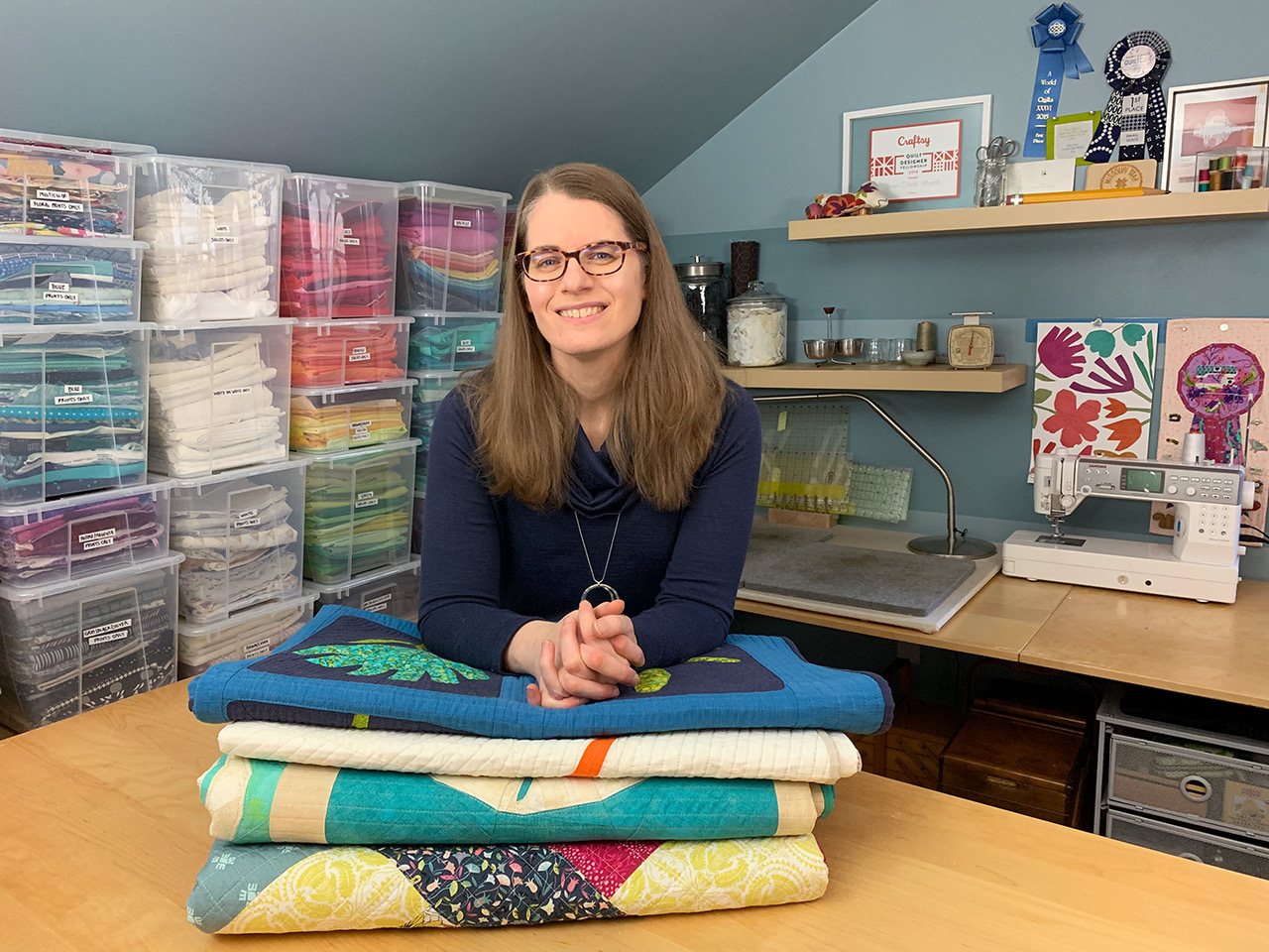 As she became more comfortable making quilts, her graphic design instincts kicked in, and she realized how quilts are often designed on a grid pattern. That led her to start designing her own quilts and experimenting with shape, color and overall composition. Soon she was showing her quilts online and entering competitions. And then things got interesting!