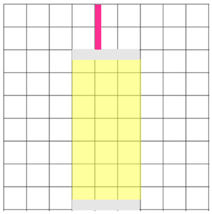 - With right sides together, sew a gray 3.5” x 1″ N piece to either short side (top and bottom) the yellow X piece. This is the drink unit.