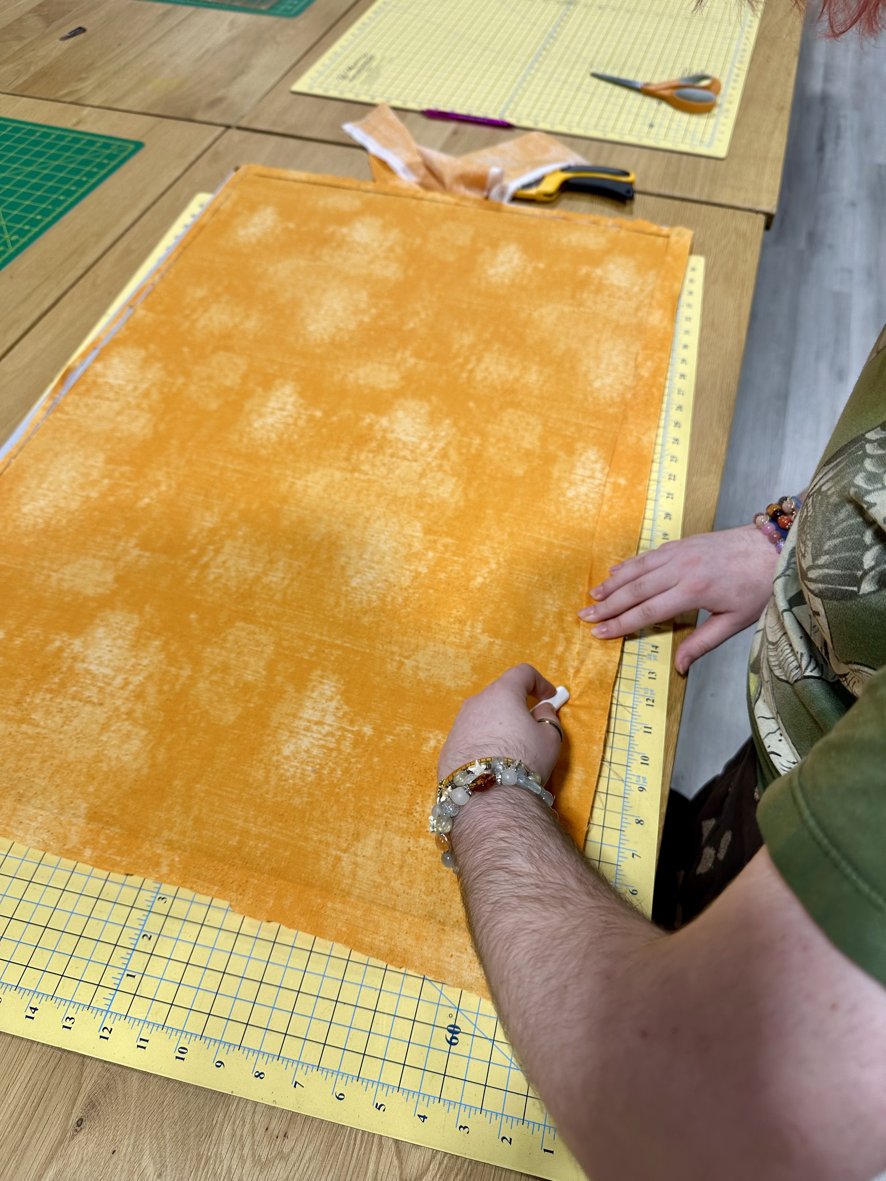Then you’ll want to lay your fabric on top of your board to make sure it fits right. With patterned fabrics you will want to position the fabric to ensure you have the print where you want it.