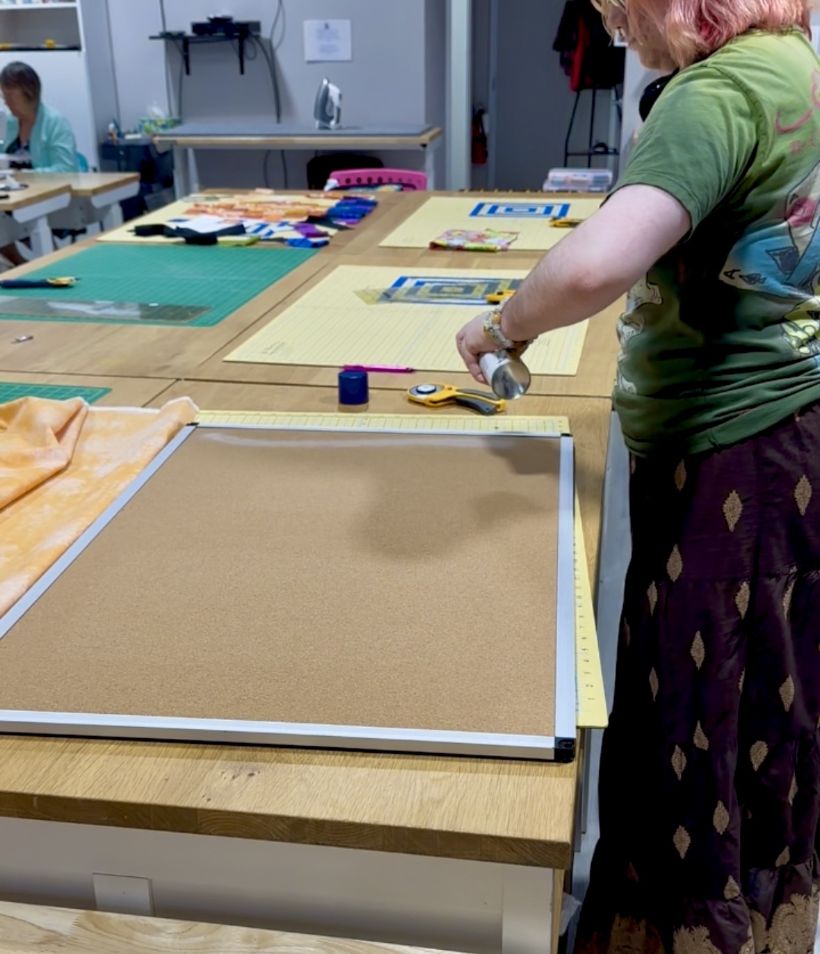 Then you will spray the 505 Temporary Adhesive Spray directly on to the cork. Be generous to cover the entire board, being sure to cover the corners well. Starting on one side of the board, firmly press your fabric onto the sprayed cork so it will stick. Use something with a pointed edge go get the fabric creases into the corners and around the outside of the board. Smooth any creases as you go to ensure a flat finish.Then, trim your fabric at the edge of the cork by running an Olfa Beginner Exacto Craft Knife along all edges. Save your excess fabric for a scrap project. 🙂