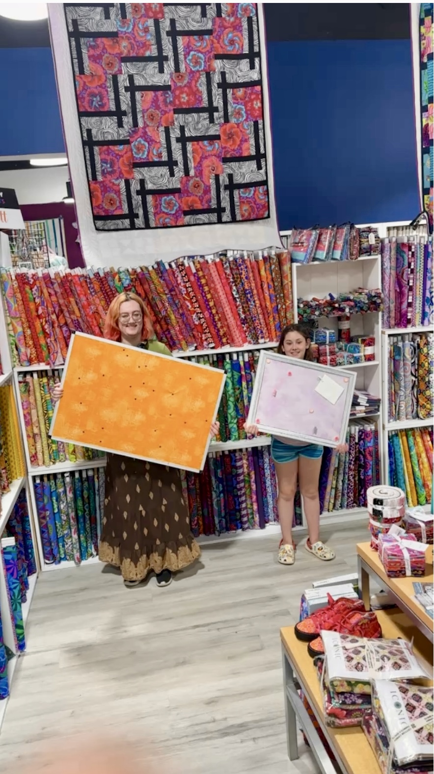 We’ve had quite a few young ladies come in to the store lately looking for cute fabric to embellish cork boards for their bedroom or dorm. Given we have 8,000 gorgeous bolts to choose from, we thought we would have Caitlyn (my niece) and Jane (Katy’s daughter) create their own fun cork boards under the direction of Kristi Lynn.