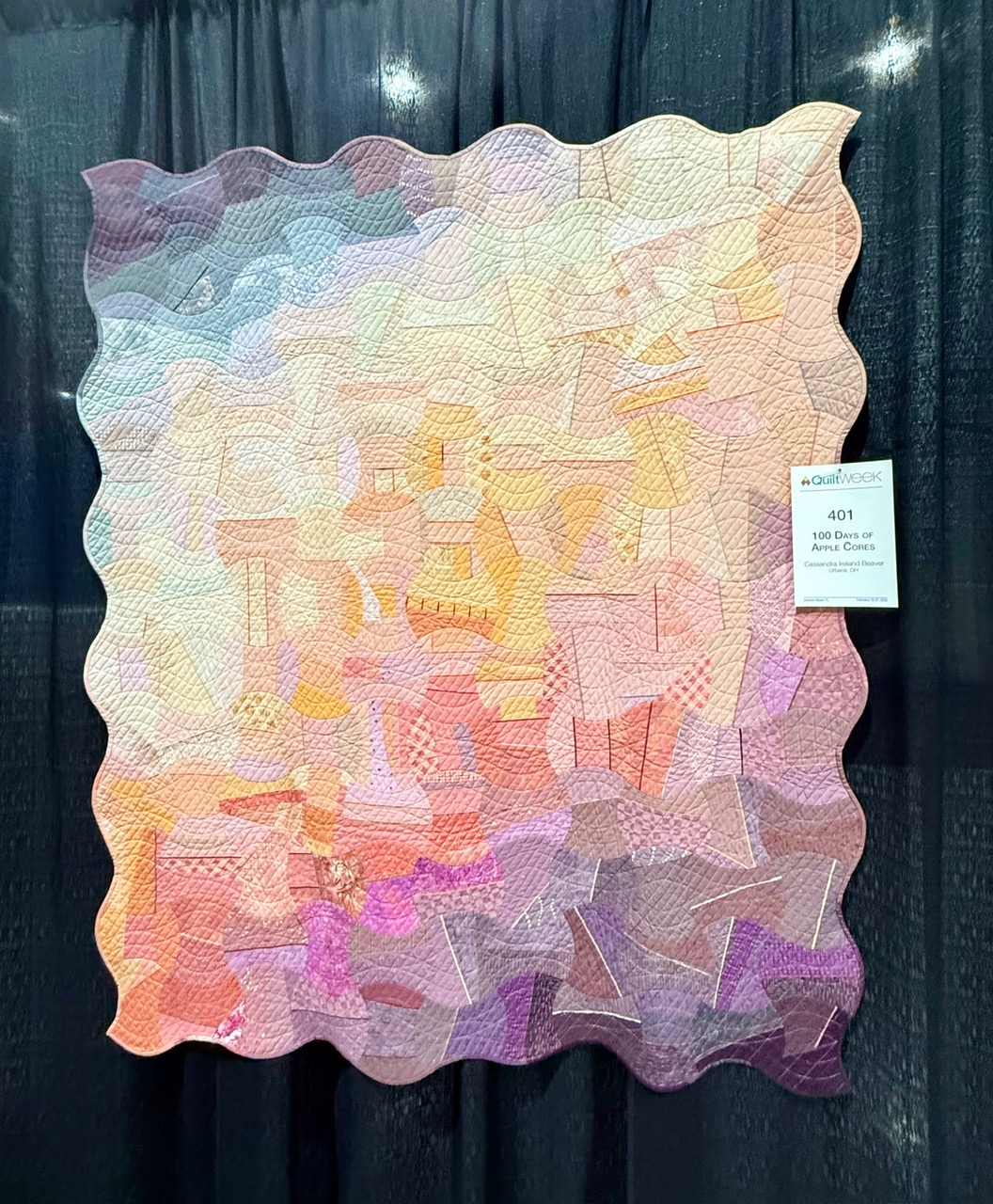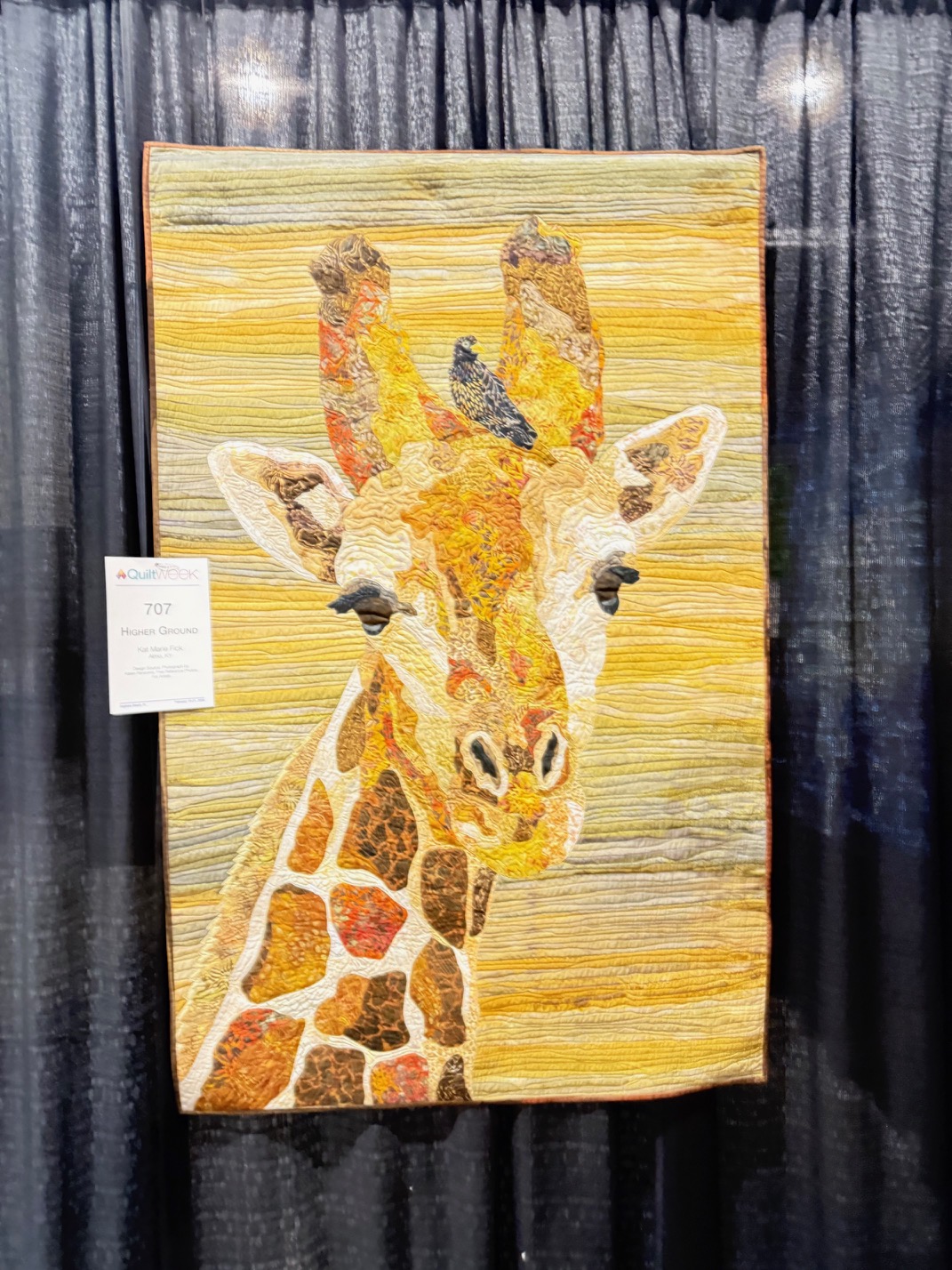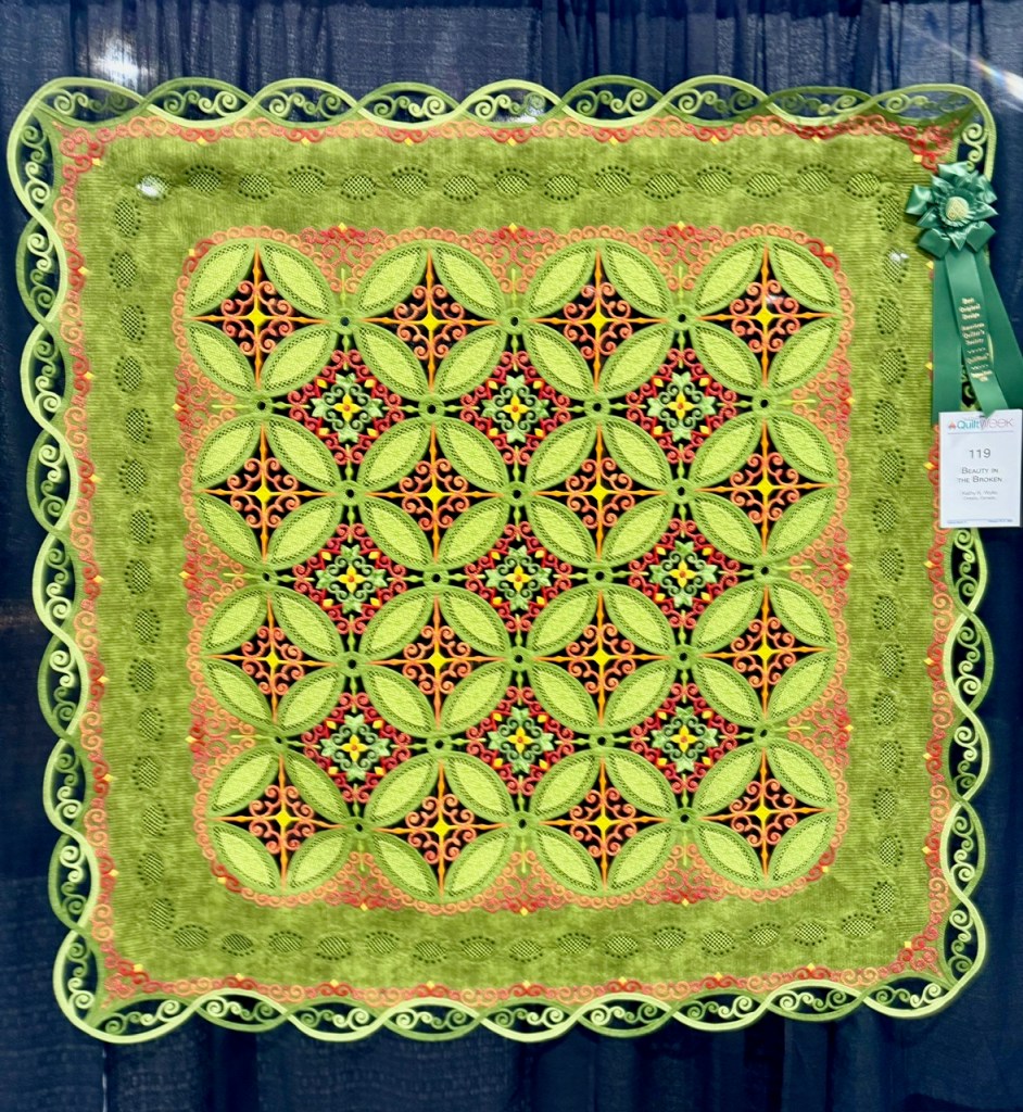Best Original Design went to Kathy K. Wylie of Ontario, Canada for Broken in the Beauty. The quilting is amazing, the color composition unique, and she used what I assume is bias binding to create free standing shapes in between the fabric. I really don’t know how to describe it other than to say the black you see is the drape behind the quilt.