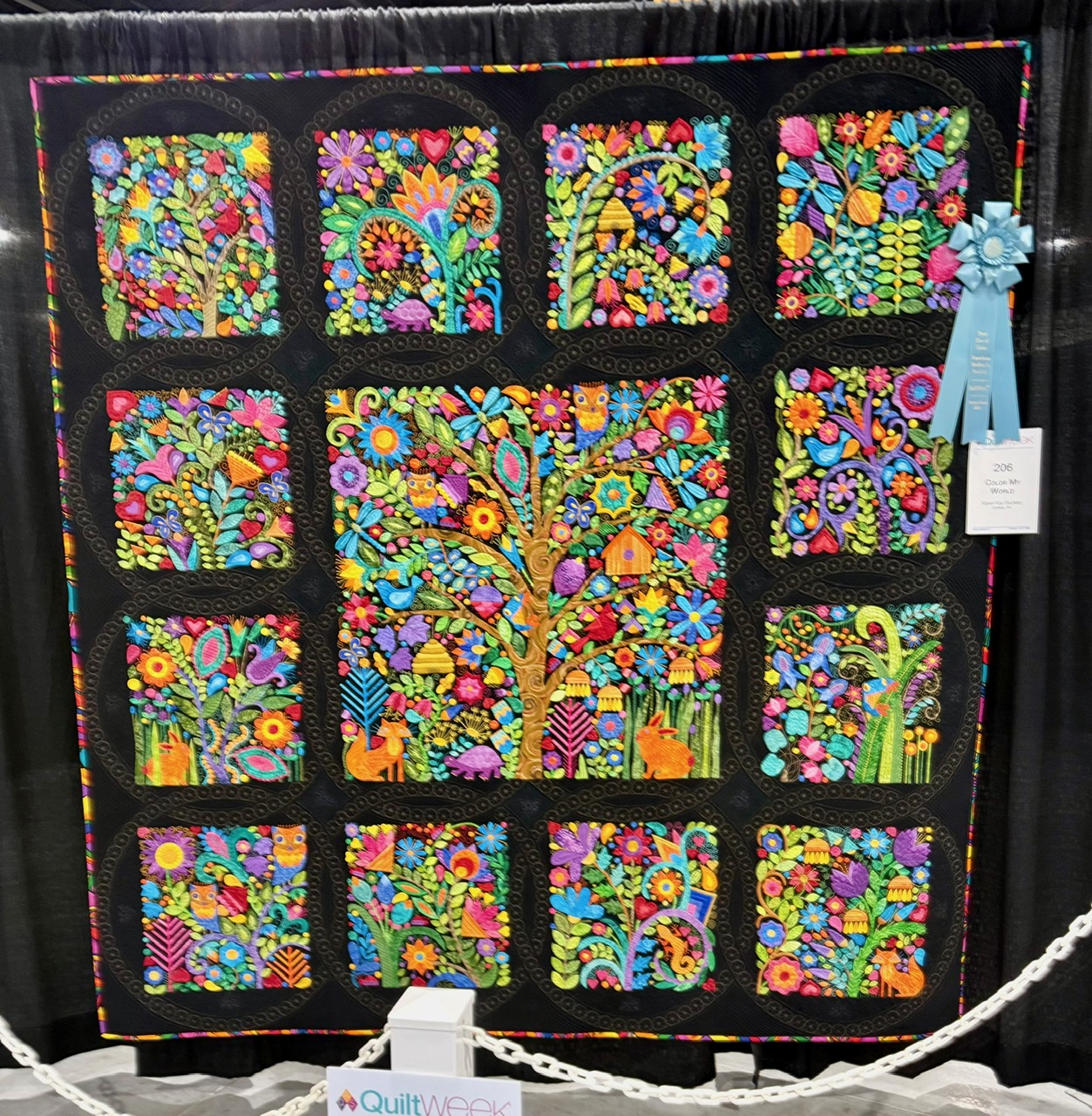 Best Use of Color went to Karen Kay Buckley of Carlisle, PA for her quilt, Color My World. You may recognize Karen’s name from her famous Perfect Scissors. Forget scissors as this quilt is flawless. The detail is astounding and the color robust. I kept going back to look again and would see other little critters or plants. Wow.