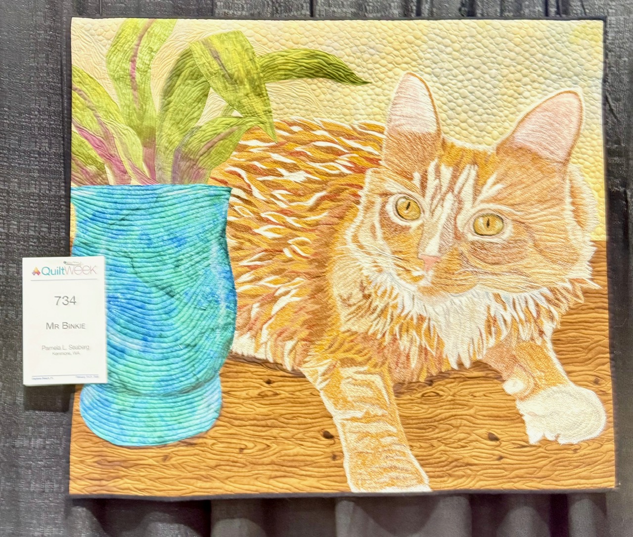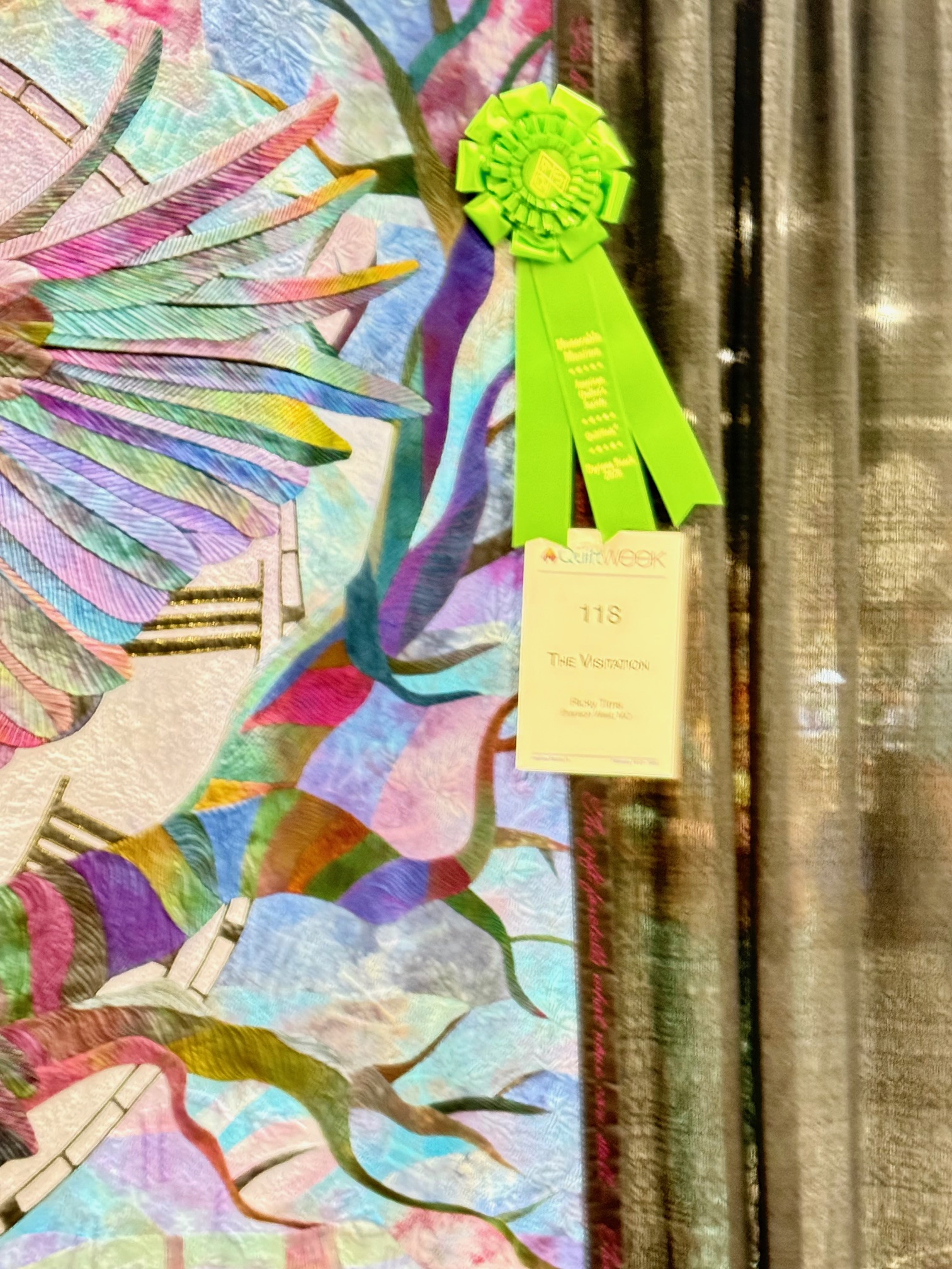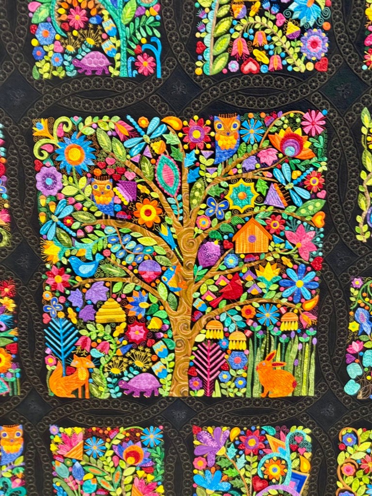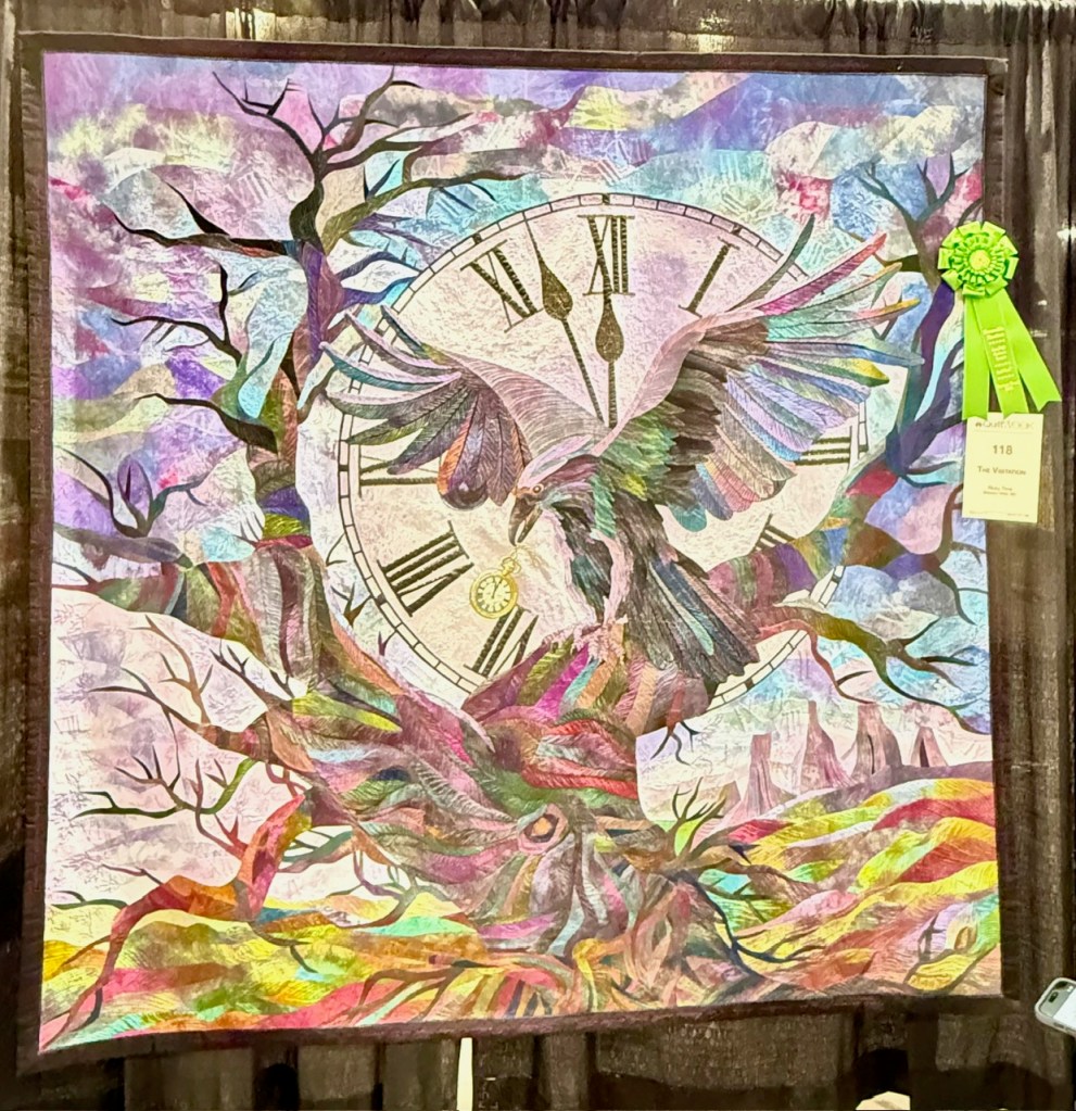 This quilt is called The Visitation by Ricky Tims (yes, that Ricky Tims), but I call it, “how the hell did he do that?” This quilt boggles my mind. It is glorious in the color, the detail, the quilt. And if you look closely, poetry from Edgar Allen Poe is embroidered into the binding. Amazing and award winning.