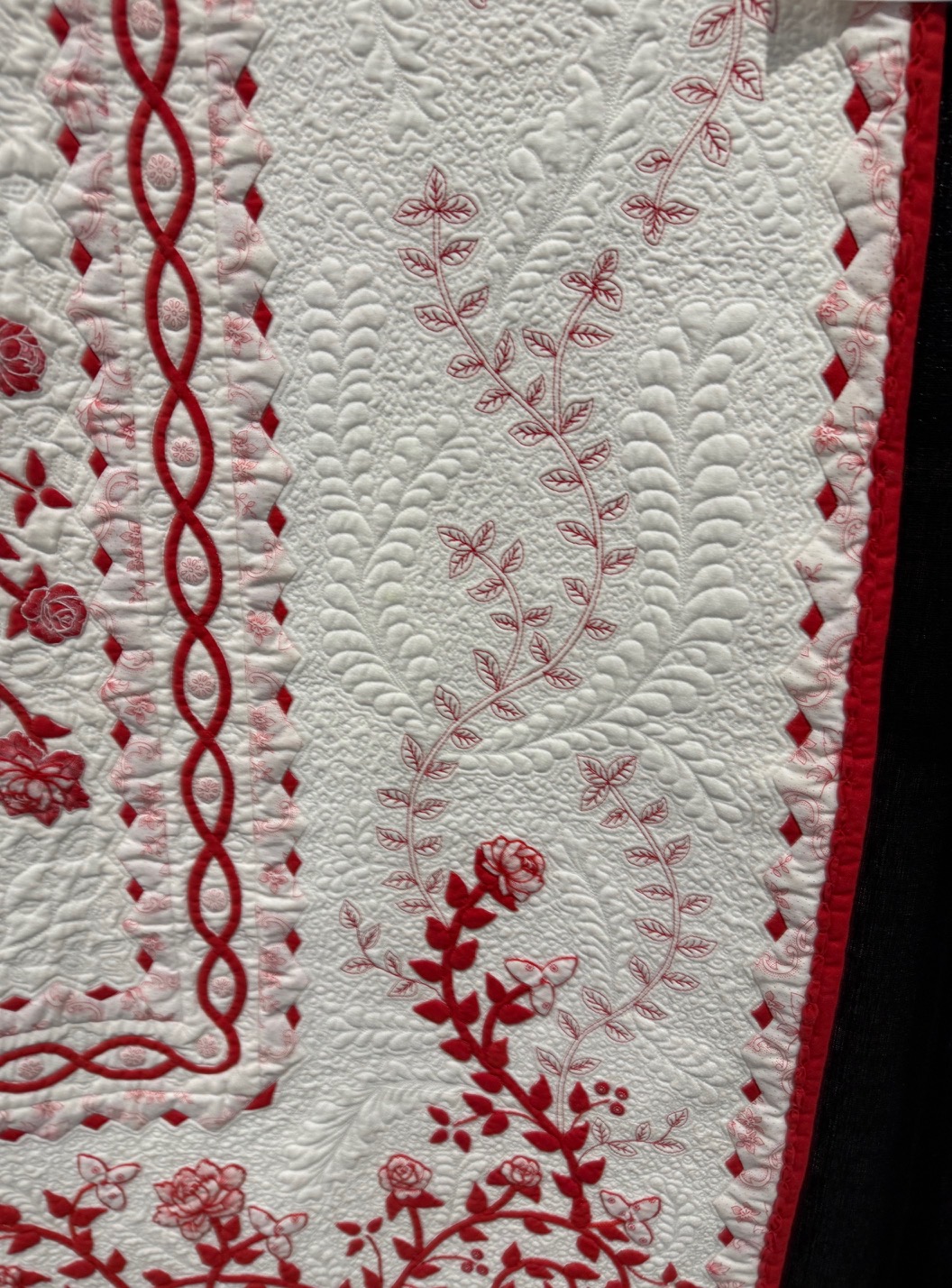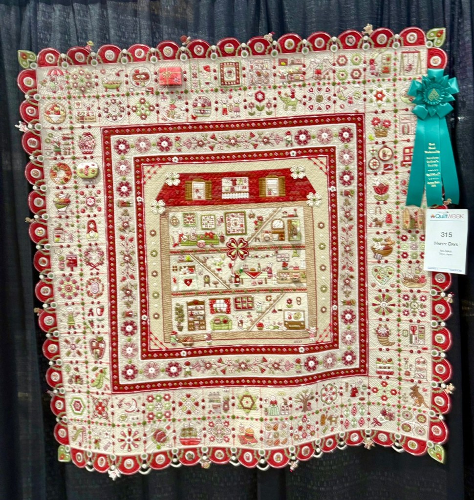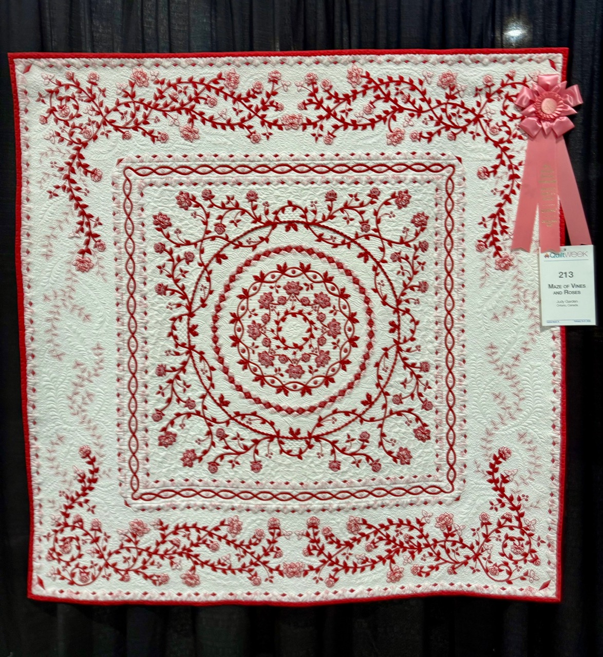 Judy Garden of Ontario, Canada won Best Moveable Machine Workmanship for her quilt, Maze of Vines and Roses. The quilting on this was divine and the use of red thread for accents was so interesting and smart.