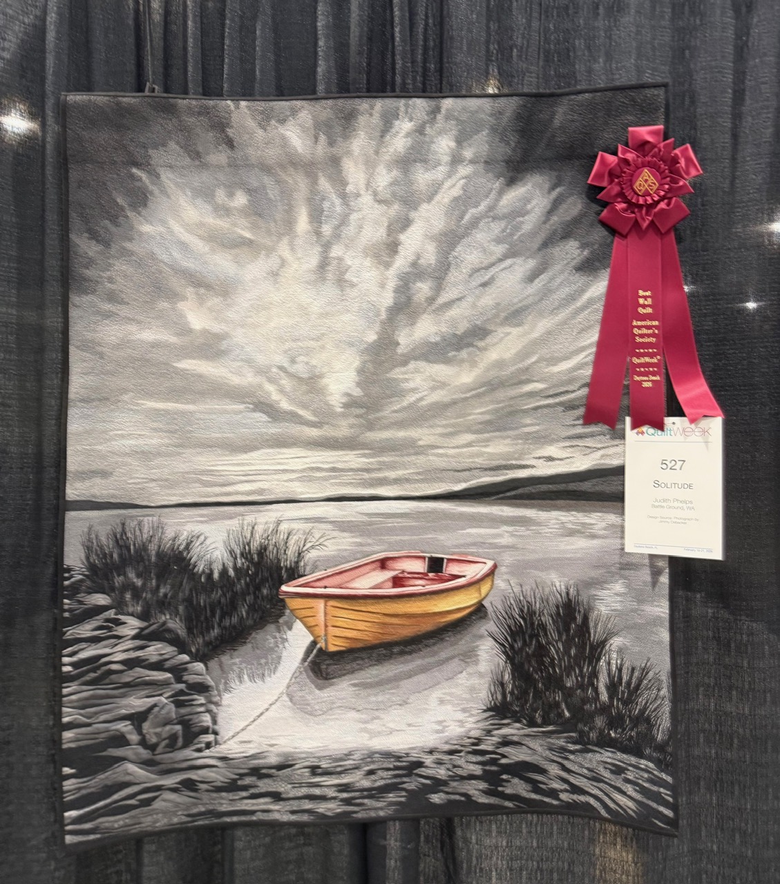 Best Wall Quilt was Solitude by Judith Phelps of Battle Ground, WA. The detail on this was amazing, and the use of thread to create color was inspirational.