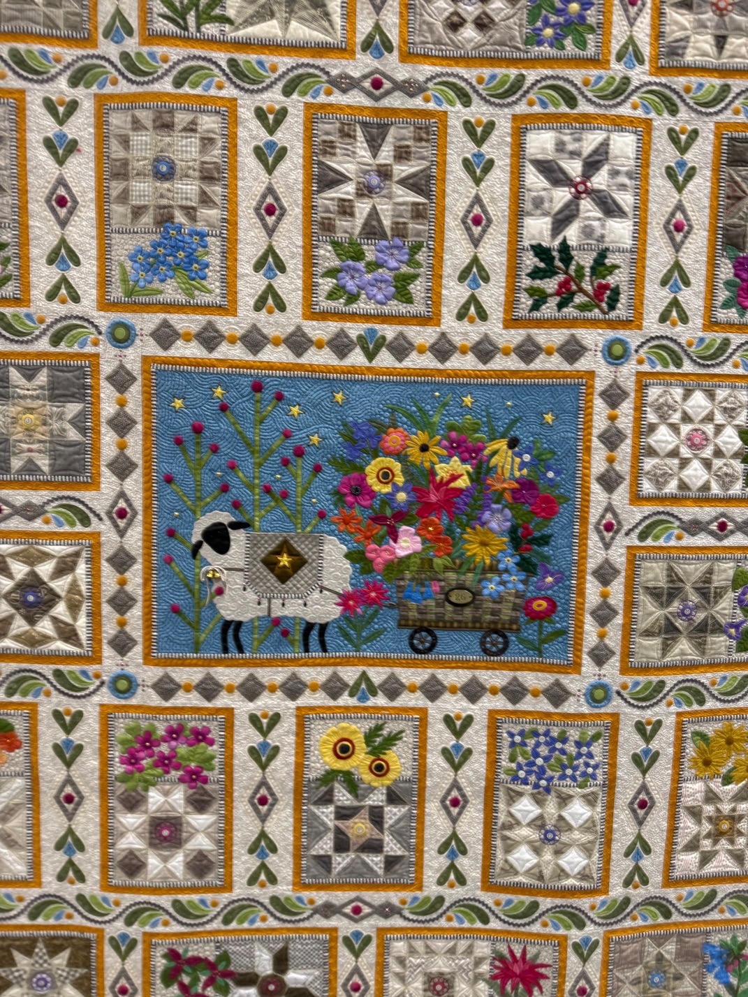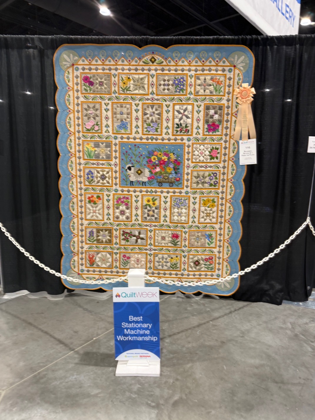 Best Stationary Machine Workmanship was won by Janet Stone of Overland Park, KS for Blooming Blocks and 1 From the Flock. Another quilt wiht great detail, and so much to see.