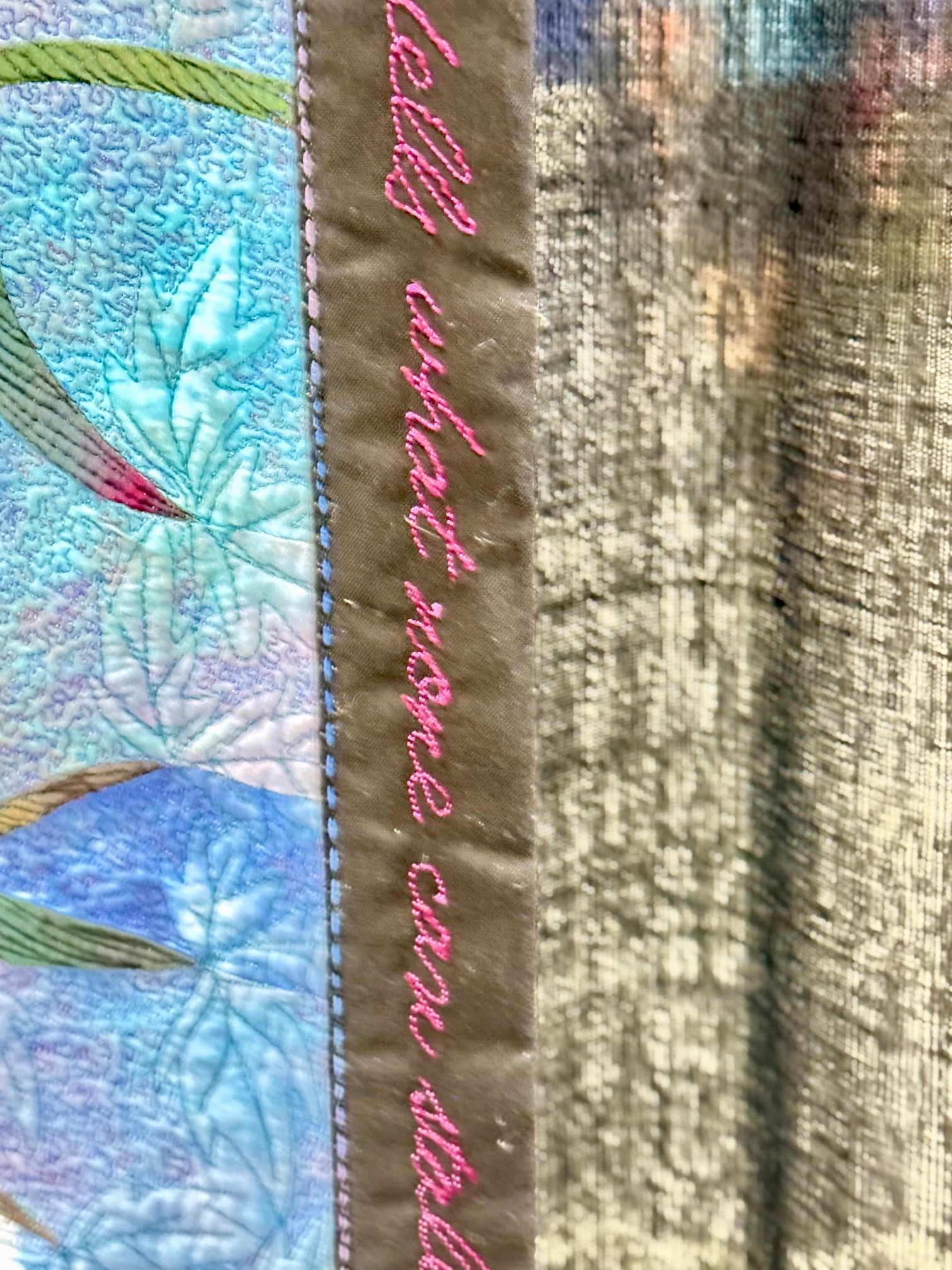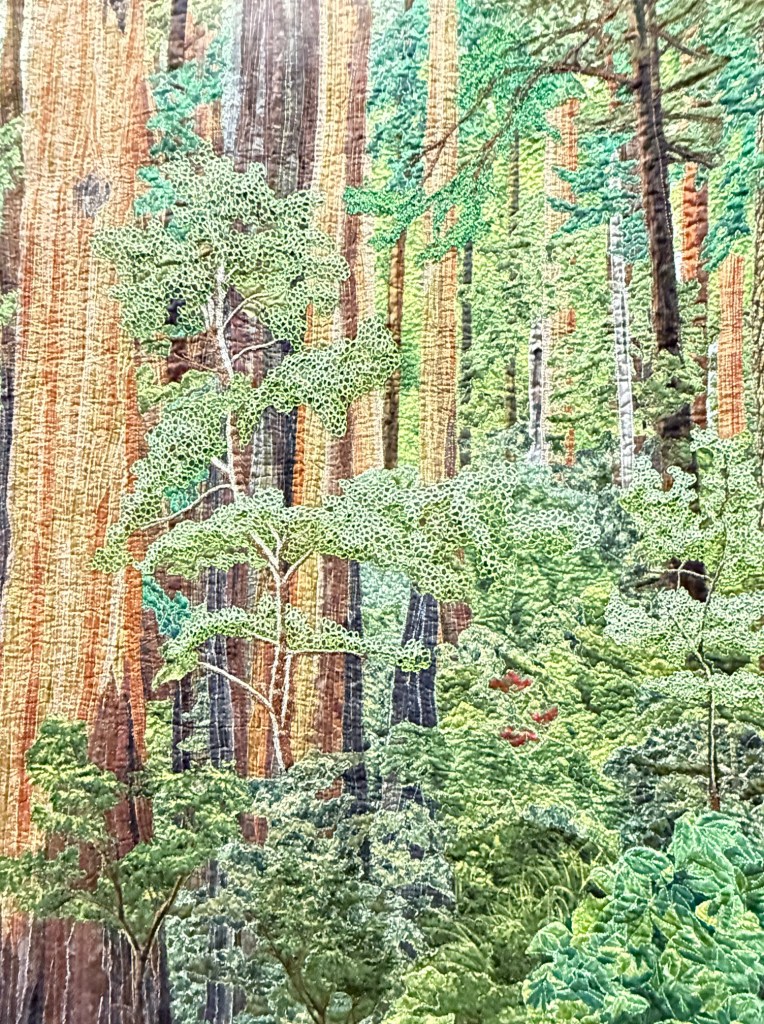 Cathedral Trees by Angie Tustison by Arcata, CA – Wow! the detail is amazing and the scale with the characters and trees is fantastical. The quilting and embroidery is amazing – check out this close up!